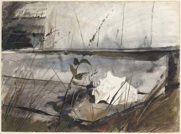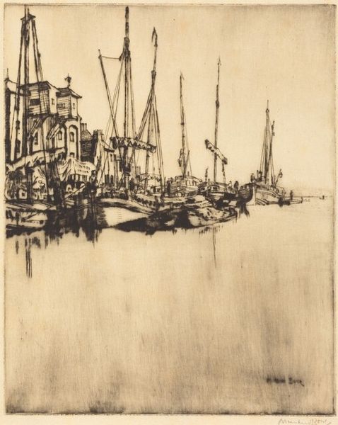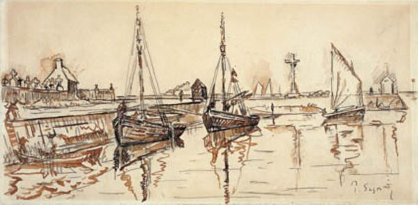 Curator: What a bleakly beautiful scene. It makes me want to light a fire and stare out a rainy window. Editor: Indeed. We are looking at Bernard Buffet's "Bateaux de pêche," from 1963, rendered with ink on paper. Note the starkness in material and application, almost brutal in its simplicity. Curator: Brutal is a great word for it. Those harsh, vertical lines feel like prison bars. I get a real sense of isolation and quiet desperation looking at this composition, as if life here offers limited chances. Editor: The near-monochrome palette limits possibilities, for sure. It highlights the importance of line in conveying the mood. Consider the sheer labor and control in producing these repetitive marks, seemingly hurried but precise. The fishing boats in the foreground contrast with the background dwellings to pose some interesting tensions. Who fishes? Who stays on the shore? Curator: Oh, I love that perspective! I'd say there's something inherently melancholic in any waterside scene like this one. Makes me consider where journeys start and end, you know? The dark lines describing those boats feel so immediate. I’m almost seasick just looking at it! Editor: Note how Buffet returns to themes of solitude, fragility, and confinement. But his commercial appeal rested largely on an ability to render such heavy themes accessible through mass production. His techniques in many ways democratized the art, made it available to wider markets. Curator: A democratized, dark night of the soul, perfect for your living room wall. The piece captures a feeling I think we all know a little bit. Something elemental and perhaps deeply unresolved. Editor: So true. Thank you. That unresolved quality leaves us contemplating not just what is on the page, but what might be. Curator: Agreed, a journey home and away simultaneously. Thanks!