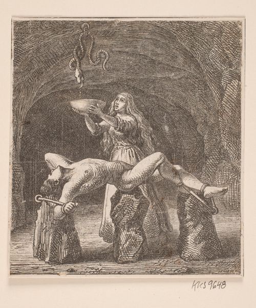 Editor: This is "Gondel bij maneschijn" or "Gondola by Moonlight" by Johann Wilhelm Kaiser, made sometime between 1840 and 1877. It's an engraving. It strikes me as very theatrical, almost like a scene from a play, with that lone figure serenading under the moon. What do you see in this piece? Curator: I see echoes of ritual and courtship played out through visual language. The moon, universally a feminine symbol, bathes the scene. Ask yourself: what does a serenade, specifically, signify? What cultural expectations and power dynamics are visually represented here? Editor: It suggests romance, longing... a traditional gesture of admiration. Is there more to it than that in the context of the time? Curator: Indeed. Consider the gondola itself. More than just a mode of transport, it's practically synonymous with Venice, carrying centuries of history. The gondola symbolizes a journey, often alluding to transitions or crossings, not merely physical, but emotional and psychological as well. How might the architectural backdrop play into this symbolic reading? Editor: It's quite imposing, maybe representing the social barrier he’s trying to overcome with his song? A physical obstacle reflecting a societal one? Curator: Precisely! It represents hierarchy, perhaps unattainability. Notice how the musician gazes upwards, his posture full of yearning. Think about the colours missing. The shades are important because it gives you the message and a sense of how life really was at the time. In our minds we fill it with our dreams and interpretations to bring it into colour, something we long for but may never truly happen. What will you retain from this encounter? Editor: I'll remember to look beyond the immediate image to decode the deeper cultural meanings embedded within it. It’s more than just a romantic scene. Thanks!