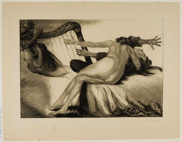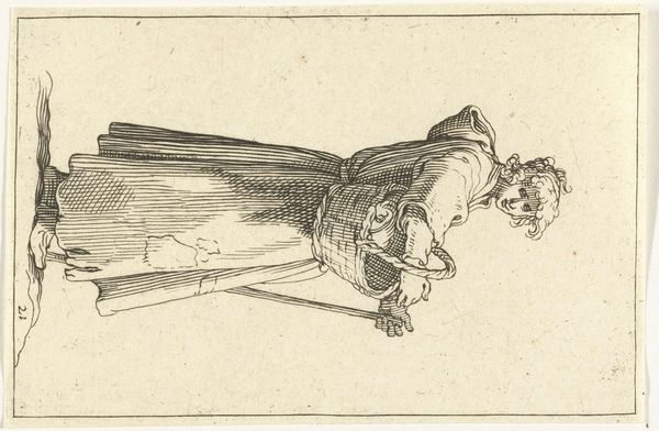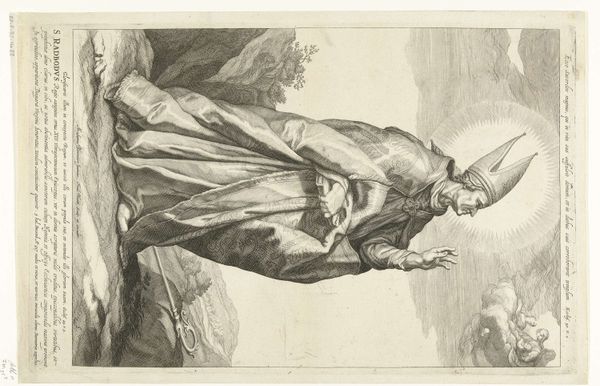 Editor: So, here we have "Saint Engelmundus of England," by Frederick Bloemaert, from before 1650, currently held at the Rijksmuseum. It looks like ink on paper... the detail is astonishing! The mood feels serene, almost dreamlike. What do you see in this piece, something I might be missing? Curator: Well, firstly, the level of detail does dance right off the page, doesn't it? But beyond that… have you noticed how Engelmundus isn't *quite* looking at us? It’s like we've stumbled into a private moment, maybe a silent prayer or contemplation. It's a slice of a soul, captured. The book held up—do you see how precariously it balances? A symbol, perhaps, of faith requiring constant, conscious effort. Editor: That’s insightful. The precariousness adds to the dreamlike feel. So much information is in one space, do you have any sense of what Bloemaert might be thinking about as he made this work? Curator: Perhaps less *what* and more *how*. Notice the almost scientific rendering of fabric versus the airy suggestion of landscape. Maybe he wasn’t just depicting Engelmundus, but wrestling with representation itself. Think about it – how do you capture the essence of holiness with ink? What parts must be present? What do you leave out? Editor: I hadn’t considered it that way! Almost a study in contrasts and how they build a story together. Curator: Exactly. And stories, like people, are never just one thing, are they? A beautiful reminder of the quiet complexities that lie within and beyond what's apparent. Editor: Thank you for revealing some of the layers within. It changes my view of art as documentation into seeing something more profound, something so beautifully alive.