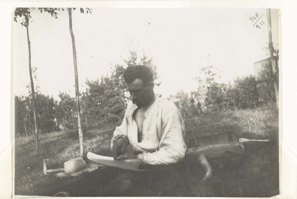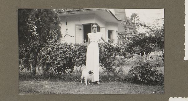 Editor: This is an untitled portrait, possibly called “Portret van Irene With met geit”, a gelatin silver print photograph from circa 1920 to 1935. The light is soft, and the composition, while simple, feels intimate. It is so interesting seeing a photo like this that is so casual. What do you see in this piece? Curator: What strikes me is the almost stark contrast in textures achieved through purely tonal gradations within a monochrome palette. The coarse, matte surface of what appears to be the surrounding foliage, constructed in the foreground plane, sharply contrasts with the smoother finish of the sitter's clothing, delineating figure from ground through material presence alone. Editor: So you’re focusing on the materials and texture instead of the people depicted? Curator: Precisely. Consider how the photograph, as a material object itself, exists. Its gelatin silver surface – capable of capturing light and shadow with such subtle variation – informs our understanding. The structural dichotomy between the subject and the means through which she is presented forces a direct encounter with form, line, and composition rather than emotional narratives. Editor: That makes sense. I was so focused on what's *in* the image. You're making me realize that the "how" is really key. Curator: Indeed. What seems seemingly transparent is, in fact, carefully constructed. Even the gentle curve described by the animal's back, mirroring that of the subject, becomes a formal relationship, a rhyme between shapes. Do you agree that a different crop would alter this relational balance? Editor: Definitely. Thanks for helping me see this artwork with fresh eyes, going beyond what it immediately depicts. Curator: And thank you for asking interesting questions!