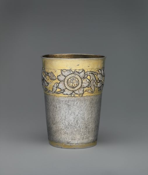 Curator: What a wonderfully preserved example of 16th-century craftsmanship! This silver beaker, currently residing at the Metropolitan Museum of Art, was crafted in 1574 by Valentinus (Felten) Dengel. It’s quite a compelling piece of decorative art. Editor: It has a cool austerity, doesn't it? That muted silver tone, and the simple, almost industrial shape. It feels somehow both ancient and modern at once. Curator: The piece’s simplicity really highlights the workmanship of the silver. And those bands of tiny repeating ornament create subtle rhythm, don’t you think? There's something almost meditative about it. These silver vessels were not simply functional. They were status symbols that carried enormous social weight. Editor: So, the question is, what stories did this beaker witness? You can just imagine this at celebratory toasts and sombre commemorations, all while signaling the affluence of the owners. What secrets did this metallic cup bear through its use? Curator: Exactly. And let's not forget the inscription along the rim. Those words are a code into the cultural mindset of the time. Editor: That script – a motto, perhaps? It really brings the beaker alive with a forgotten voice. I can see it on a noble's table amidst a bustling Renaissance feast. All this and the silver’s soft sheen whispering forgotten allegories... Curator: These artifacts truly transport us through time. Examining this vessel is like opening a window into a bygone era, revealing the rituals and values of the Renaissance world. Editor: Indeed, it is remarkable how such a simple vessel can evoke a profound sense of history and intrigue. It is a potent symbol of humanity's eternal impulse to make art objects to both celebrate and quietly mark our journeys.