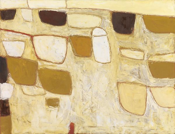 Editor: This is "White, Sand and Ochre" by William Scott. It's quite large, with muted colors and simple geometric shapes. It feels almost like a map of… something. What strikes you about it? Curator: Its abstraction speaks to me of liminal spaces, perhaps reflecting the shifting social landscapes of post-war Britain. Notice the fragmented forms; do they not suggest a deconstruction of traditional societal structures and gender roles? Editor: I see the shapes, but not necessarily societal structures. Curator: Consider Scott's position as a male artist navigating a changing world. Are these forms perhaps stand-ins for patriarchal constructs being questioned and reshaped? How does this inform your understanding? Editor: That's a compelling angle. I'll definitely rethink my interpretation considering that. Curator: Exactly! By acknowledging the historical and social context, we can reveal deeper meanings.