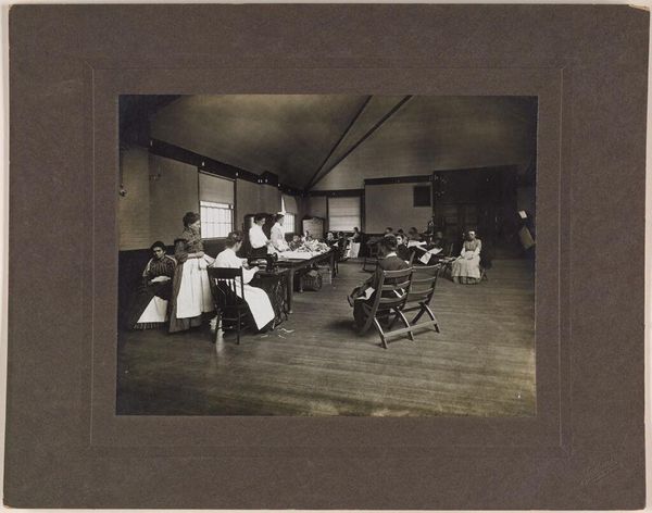 Curator: This photograph by Woodhead Studio is titled "Defectives, Epileptics: United States. Massachusetts. Palmer. State Hospital for Epileptics: Marking room, 1907." It captures an interior scene within the state hospital. Editor: The composition feels stark and unsettling. The muted tones and the emptiness of the room, even with figures present, create a heavy atmosphere. Curator: Indeed, the image offers a glimpse into the institutional practices of the early 20th century. These institutions were often sites of both care and control, reflecting broader societal attitudes toward disability and illness. Editor: The title is incredibly blunt, labeling people by their conditions. It forces us to confront the dehumanizing language used at the time and the power dynamics inherent in these spaces. Curator: It's a poignant reminder of how language and institutional structures can shape our understanding and treatment of marginalized groups. Editor: Absolutely. It's a call to critically examine the legacies of these practices and advocate for more equitable and compassionate approaches today.