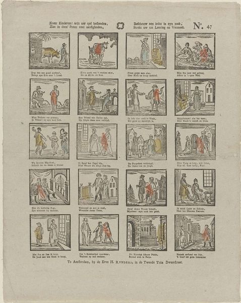This print titled "Ziet in deze prent de vrolijkheid, Van Saartje Jans de keukenmeid" (See in this print the cheerfulness of Saartje Jans, the kitchen maid) was created by Broese & Comp. This work gives us insight into the life of Saartje Jans and perhaps the lives of many women in her role. The composition of the print, with its serial boxes depicting her daily life, is reminiscent of a comic strip. Each square is a tableau of her domestic work, revealing an intimate narrative of her life as a servant. These scenes, while seemingly simple, are imbued with societal expectations for women during this time, particularly those from the working class. It begs the question: where is her joy? Is it found in her work, or is it derived from something else? This piece captures a glimpse into the everyday existence of a woman whose story might have otherwise gone unrecorded. Through Saartje, we confront the untold stories of countless women whose labor and lives were often unseen.