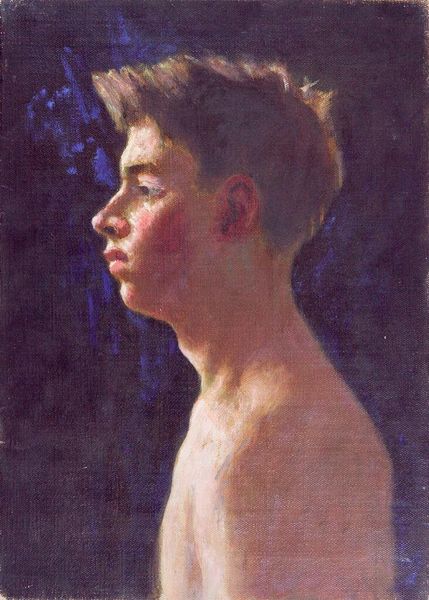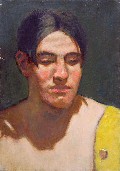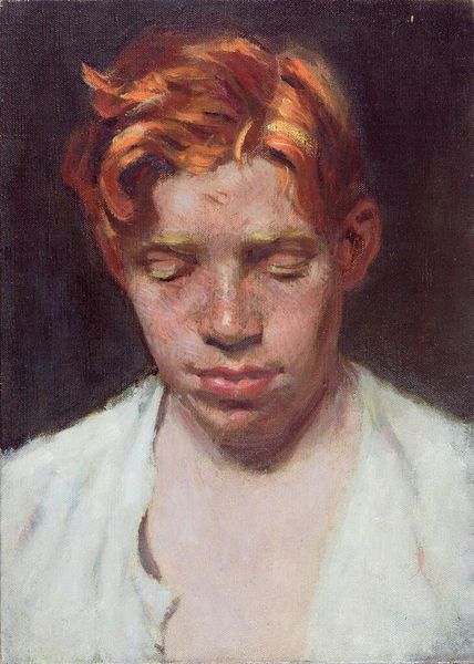 Curator: Ross captures such a melancholic mood in this small painting, Portrait of a Young Man. Look at the dark, muted colors and the downward gaze. Editor: It feels like an exercise in vulnerability, or maybe even shame. I’m curious about the absence of a known date—how does that impact our understanding? Curator: It invites us to think more about the universal experience of introspection, perhaps, or the fleeting nature of youth. The redness around his ear almost glows. Editor: Absolutely. This portrait also feels like it's participating in a longer history of representing young, often racialized, bodies as objects of contemplation within the art world. Curator: Do you think the artist was aware of that gaze? It's almost too easy to see him simply lost in thought. Editor: That’s precisely the tension, isn't it? Navigating intention versus impact. It’s a tightrope walk between the personal and the political. Curator: Well, it gives me a lot to think about. I'm glad we took a moment with it. Editor: Me too. It’s a reminder that even the quietest images can hold complex dialogues.