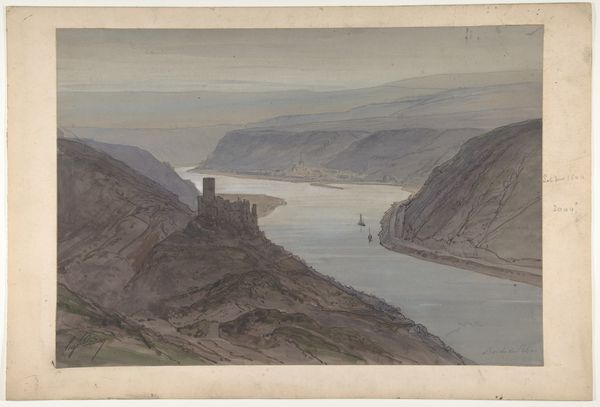 Editor: This is "View on the Meuse or Moselle," an early 19th-century drawing by someone from the British School. It’s sepia-toned and depicts a ruined castle overlooking a river valley. It feels… wistful? What do you see in this piece? Curator: Wistful is perfect. It’s as if the artist is contemplating the slow crumble of time itself. It makes me think of those romantic poets searching for the sublime in nature and ruin. Do you notice how the artist uses light and shadow? Editor: Yes, the contrast makes the castle seem even more dramatic against the vast landscape. Curator: Exactly! And the river winds like a ribbon connecting past and present. It's a conversation between what was and what is becoming. Art, isn't it grand? Editor: It is, especially when you put it that way. I see so much more now.