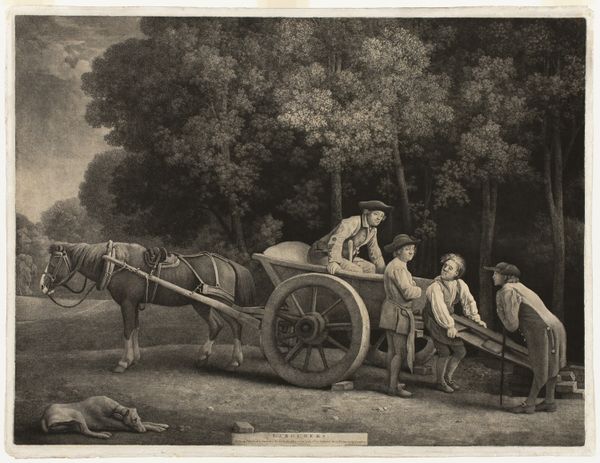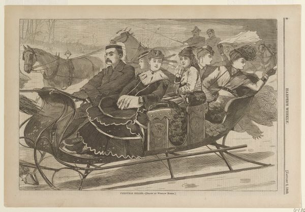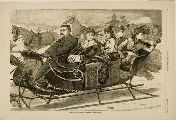 Curator: Winslow Homer's print, "The Picnic Excursion," from 1869 offers us a fascinating glimpse into post-Civil War leisure culture. Editor: My eye is immediately drawn to the texture. Look at the meticulously rendered lines of those dresses, the horse’s mane—it's incredibly detailed for a print, almost vibrating with activity. Curator: Absolutely. This image appeared in "Appleton's Journal," a widely circulated periodical, revealing the rising popularity of outdoor leisure activities among the middle class. Picnics became symbolic of social mobility and a yearning for simpler times amid rapid industrialization. Editor: The composition also speaks volumes. The artist segments space into planes – the horse-drawn wagon loaded with passengers in the background, the standing ladies, and the squatting couple attended to by a small dog are set across the visual field – a sort of visual hierarchy of bourgeois life? Curator: Precisely. Homer captured this rise in leisure activities after the Civil War by frequently including women in his genre paintings, showing that societal hierarchies had shifted to acknowledge gender roles. And indeed class! Notice the figures dressed in elaborate ensembles disembarking from their ornate carriages in a marked fashion that displays both cultural standing and taste. Editor: There's a certain reserve present too. These aren't joyous expressions we are privy to; rather, there are closed-off glances, creating a palpable sense of distance between the viewer and the viewed. Curator: That’s typical of Homer’s approach; rather than overtly romanticizing or critiquing society, he simply presented it as he observed it. He captured the ethos, showing these subtle class nuances. Editor: This allows us to really think about the societal implications embedded within the aesthetic presentation. Winslow Homer captured the mood, didn't he? The very human, fleeting impressions of life within visual parameters... Curator: Agreed, viewing his works are an invitation to explore and understand not just what they show but what that moment represents about American culture.