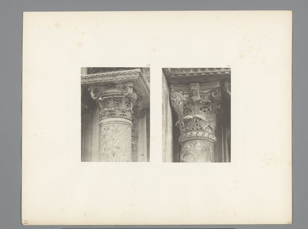 Editor: Here we have a photographic print titled "Two images of Corinthian Capitals of San Marco in Venice," attributed to Carl Heinrich Jacobi, created sometime before 1885. The grainy texture of the image lends a certain antiquity to the classical subject. What strikes you about it? Curator: It’s funny, isn't it, how a photograph meant to capture objective reality can instead evoke a sense of faded grandeur, a melancholic echo of past empires. It’s almost as if the artist isn't just showing us these capitals but whispering a story of Venice’s rise and, perhaps, its inevitable metamorphosis. Do you see how the light plays on the acanthus leaves? They seem to breathe. Editor: They do have a kind of soft vitality! What would it have meant for someone to photograph these details then, compared to our experience today? Curator: Now, you can snap a pic of the same capital in seconds and slap it on the 'gram, instant gratification and fleeting attention. But back then, this was an act of preservation, a testament. Jacobi wasn't just documenting, he was carefully curating our gaze. He understood that these details—these leaves frozen in stone—held the soul of the city, accessible, albeit filtered, for future admirers. Editor: So, it’s not just about the columns themselves but about the act of choosing to capture them? Curator: Precisely. Photography, then, became a conversation across time, and we are a part of it now. Do you feel Venice calling? Editor: Definitely, especially the way the photograph isolates these ornate forms, and suggests stories far grander than they suggest alone. Curator: Wonderful - just how art should do. Make us ponder what we truly perceive!