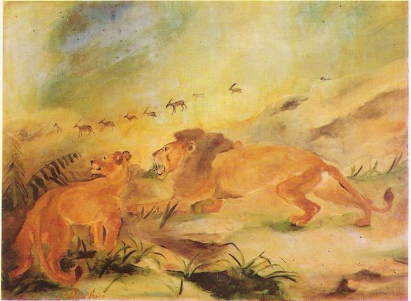 Editor: Here we have "Dream Jungle," a gouache painting by Margareta Sterian. I find the layering of animals quite striking, and the whole composition evokes a certain dreamlike quality as the title suggests. How would you interpret this work, focusing on its artistic components? Curator: What I see immediately are the forms, abstracted and softened. There is a distinct lack of clear demarcation between the animals, isn't there? It suggests a fluid, interconnectedness, as though the boundary between one creature and another is porous. This ambiguity is echoed in the indeterminate space - we can recognize landscape elements, but these are far from literal, contributing to the elusive feel of the composition. Editor: So, the forms and lack of definition is key? It makes me think about the blurring of reality and imagination. Curator: Precisely! And consider the subdued color palette. While varied, the tones are muted, reinforcing this sense of otherworldliness, distancing us from the sharp realities of everyday experience. What structural elements do you think contribute to the fantastical mood? Editor: Perhaps how they are all scattered and seemingly floating, and there's no real point of focus or traditional background. How the lighter and darker areas seem evenly distributed could play into the atmosphere. Curator: A perceptive observation. Note also the application of gouache. This medium lends itself to a soft, almost ethereal texture, which reinforces the dreamscape quality, doesn’t it? Editor: It does! I've always thought about composition and the narrative behind an image. You've helped me see the importance of individual components contributing to the image's narrative and mood. Curator: Yes. A deeper look reveals a painting focused not on subject or narrative, but a structural representation that triggers the feeling in the title. Form, color, and technique all harmonizing.
