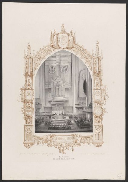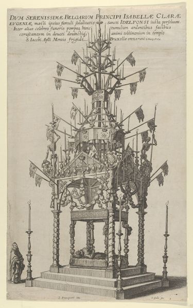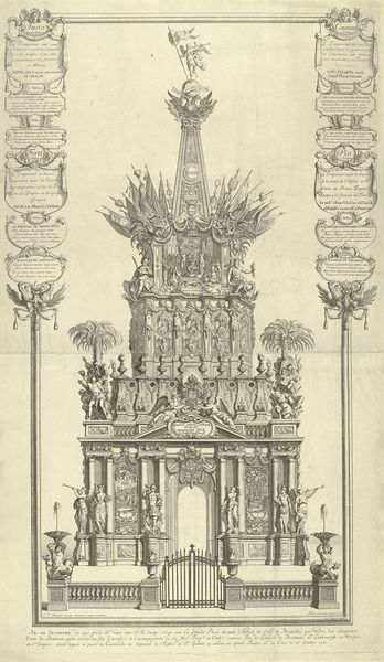 Curator: This is a print from 1695 titled "Mausoleum erected in Westminster Abbey for the deceased Queen Mary Stuart." It’s by an anonymous artist, held at the Rijksmuseum. It looks incredibly ornate, almost like a stage set. What grabs your attention first? Editor: The overwhelming amount of detail, I suppose. All the crowns and sculpted figures feel deliberately excessive, but how does that connect to Mary Stuart? What’s the message behind all of this ornamentation? Curator: Well, consider the medium: an engraving, a relatively reproducible and therefore accessible format. Think about who would have commissioned this. Was it a private expression of grief or something intended for wider consumption? This mausoleum, whether real or imagined, is being presented as a symbol of power, and more importantly, legitimate succession. Notice how the materials depicted—stone, precious metals—are rendered meticulously. Is it to remind us of actual riches or the *idea* of richness and status? Editor: So it's less about mourning a person and more about constructing a narrative around power? The emphasis is on displaying authority, perhaps solidifying the Stuart legacy after her death, instead of focusing on, say, the personal qualities of the deceased. Curator: Exactly. The visual language itself—the repetition of symbols, the architectural scale—suggests a machine for producing meaning. Do you think there's an inherent tension between the purported spirituality of a mausoleum and the blatant display of wealth? Does the print flatten or elevate it? Editor: It does feel contradictory now that you mention it. The engraving’s almost clinical depiction of luxury feels almost critical, even though that may not have been the intention. I never considered how the very act of reproduction in print could itself be a commentary. Curator: Considering art from a materialist angle gives you tools to start questioning seemingly obvious symbolism and thinking about the process and context of its making. Editor: I will definitely consider how social status may dictate art and ways of consuming it.