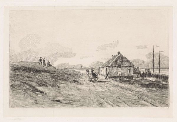 Editor: Here we have Jacobus Ludovicus Cornet’s "Landscape with an Empty Haystack," created in 1851 using ink on paper. The intricacy of the lines forming this rural scene is captivating. What strikes you most about its composition? Curator: The interplay of light and shadow is quite remarkable. Notice how Cornet uses variations in line density to create tonal contrasts, giving the drawing a three-dimensional quality despite the limited medium. The stark verticality of the posts supporting the haystack roof serve to direct the gaze across a flat plain, dotted with very soft forms of what seems to be architecture. How does the strategic arrangement of these elements affect your perception of depth within the scene? Editor: It flattens the image but in a strangely beautiful way, because it's also very detailed. What about the thatched roof, how does that relate to everything? Curator: The texture of the thatched roof, rendered through a meticulous accumulation of short, hatched lines, introduces a compelling visual rhythm, further elaborated with thin lines across a broad space. What theoretical frameworks might illuminate Cornet’s structural handling of depth and perspective here? Editor: Semiotics could work, the marks of the ink representing rural life... The eye is guided from the textured haystack, to the distant structures through the linear fence creating a visual sentence. But isn't realism about depicting exactly what you see? Curator: Indeed. How does Cornet reconcile his commitment to realistic depiction with the artistic license he employs in structuring the composition and manipulating the texture of the various elements? Is he being as objective as possible, or do you see an intervention of self into the depiction? Editor: It does feel mediated; somehow melancholic. Thank you, that was quite illuminating. I noticed so many layers of formal structure that I glanced over originally. Curator: My pleasure. It’s through precisely this process of careful observation and theoretical engagement that we unlock the true potential of visual art.