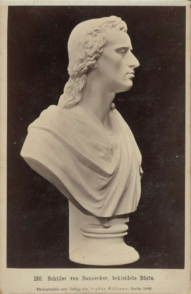 Editor: This is a photograph titled "Buste van Jean Rotrou" taken sometime between 1850 and 1900. It's currently held at the Rijksmuseum, and looks to be a gelatin silver print of a sculpture. The photographic tones create a striking impression of this Neoclassical-style bust. What catches your eye about this image? Curator: Ah, yes! What I find so striking is the conversation between mediums. We're not simply looking at a sculpture, but a photographic interpretation of one. It invites us to think about reproduction, about how artistic expression evolves through different technologies. Imagine, someone chose to capture this sculpture, freeze it in time, offering us *another* layer of artistry. Doesn't that tickle your curiosity? Editor: It does. The lighting seems deliberate, almost theatrical. Curator: Precisely! The photographer, Adolphe Giraudon, clearly wasn't just documenting. He sculpted with light and shadow, emphasizing the texture of the marble (or the *idea* of marble!). Look at the way the light caresses the lace collar, or the soft rendering of the hair. Tell me, what does that choice evoke in you? Editor: I guess, it's meant to highlight Rotrou’s status. There's almost a romanticized reverence in the image, but also it’s so still and calm. A really curious tension between dynamism and control. Curator: Beautifully put! It also whispers about the passage of time, doesn't it? A playwright memorialized in stone, then re-memorialized in silver… What a lovely echo across history. Thank you, I feel like I noticed a new nuance that I never grasped. Editor: It’s so fascinating to see how one medium can re-interpret another and transform something old into something new.