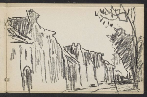 Alexander Shilling created this sketch with graphite, capturing a scene of houses nestled near a bridge. The drawing has a raw, immediate quality, evident in the energetic strokes that define the forms. Notice how Shilling uses line to suggest depth and texture. The density of lines creates shadowy areas while the sparser strokes indicate lighter, open spaces. The composition is carefully arranged to lead the eye through the scene. The architecture blends with the surrounding foliage, suggesting an integration of the built environment with the natural world. This interplay between line, texture, and composition destabilizes conventional distinctions between nature and architecture. Shilling encourages a dialogue between the organic and the constructed. The sketch evokes a sense of place while exploring broader themes of human presence within the landscape. It’s a study in visual communication, where simple lines convey complex ideas about space and perception.