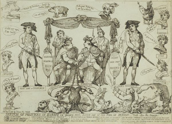 James Gillray made this etching titled 'John Bull te grazen genomen door de Europese machten' in 1795. It captures the complex political climate of Europe during the late 18th century. The cartoon depicts John Bull, a personification of England, being harassed by European powers. This satire reflects Britain's isolation and vulnerability amidst the French Revolutionary Wars. Gillray uses caricature to mock the leaders, exaggerating their features to symbolize their political agendas and moral failings. The imagery underscores themes of national identity and power dynamics, highlighting the shifting alliances and rivalries that defined the era. Gillray often used his art to critique the social and political issues of his time, reflecting both popular sentiment and his own, often conservative, beliefs. Through this emotionally charged and visually arresting work, Gillray invites viewers to reflect on the complexities of nationhood and the human cost of political maneuvering.