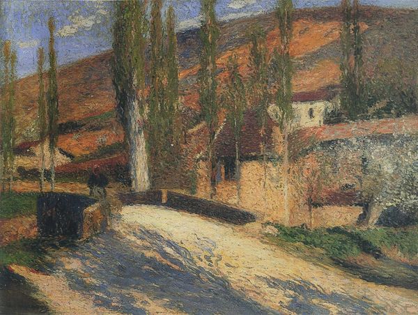 Curator: This is Robert William Vonnoh's "Spring in France," painted in 1890, an oil-on-canvas marvel currently residing here at The Art Institute of Chicago. Editor: Ah, the first breath of spring just bursts from the canvas, doesn’t it? There’s such a golden haze draped over everything—it’s positively dreamy! Curator: Exactly. Vonnoh's clearly working 'en plein air' here, capturing that fleeting quality of light and atmosphere with the broken brushwork typical of Impressionism. Observe the almost haphazard yet deliberate placement of each stroke. Editor: Yes, look how those little dabs of paint create this shimmering effect, especially in the grass! It’s like the whole scene is vibrating with life. Do you feel transported? I do. Like a warm memory of a perfect afternoon. Curator: He emphasizes the relationship between color and light over rigid forms. Think about the significance of light within Romanticism as well: it unveils a sublimity underlying an awareness of natural forces. The composition’s really quite interesting as well: he's balanced the more structured architecture with the sprawling, untamed meadow. Editor: Untamed is a good way to say it! Almost spilling off the sides, this sense of boundless space...makes me think of escaping the city for some peace and quiet in the countryside. This could serve as some beautiful metaphor...I'm just trying to piece it all together. Curator: I appreciate your reading! And indeed, through Vonnoh’s sophisticated use of texture and tone, he successfully conveys not just the *look* of spring, but its essence. This interplay of light, shadow, and form, and the themes you brought up… perhaps they resonate so strongly precisely *because* they point to something inherently and deeply natural! Editor: It has definitely turned my gears today; time to process some information in real time. Overall a good one.