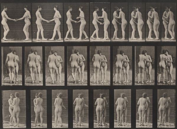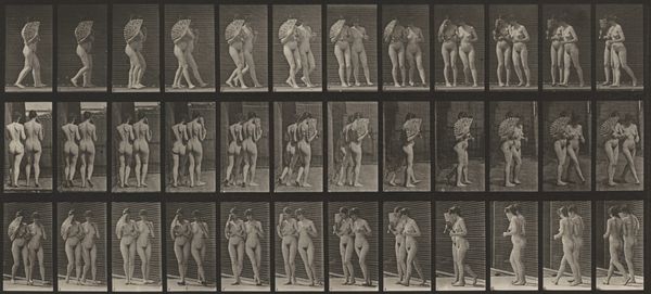 Curator: It’s mesmerizing, isn't it? All these discrete moments captured within one gelatin-silver print. There is something almost dreamlike in the arrangement. Editor: Indeed! This is plate number 245 from Eadweard Muybridge's *Animal Locomotion*, taken in 1887. These photographic studies weren't created in a vacuum; they were tied directly to Muybridge's funding and commissions within the University of Pennsylvania, as well as representing a significant step in the development of photography and motion study. Curator: It's striking how it dissolves the illusion of stable identity through photographic process; a continuous dance constructed out of distinct photographic cuts. The print invites contemplation of the body as material and also an object in time. It gives emphasis to production process. The act of taking numerous pictures. It presents both a static collection of items while at the same time an almost dreamlike animation of figures. Editor: Absolutely. Muybridge wasn't just after scientific accuracy. *Animal Locomotion* gained popularity and generated money partially because of its engagement with both aesthetic ideals and contemporary attitudes regarding the human body. In this photograph, it presents the female form for educational objectives while yet fitting in with prevalent aesthetic ideals. Furthermore, images such as this circulated in a social and cultural landscape increasingly obsessed with visualizing and controlling movement and bodies. Curator: So true, we shouldn't disregard the relationship between Muybridge's work and the growing commodification of image-making during that era. What do you consider to be the modern equivalent to this technology when discussing photographic materialism? Editor: Perhaps CGI or deepfake technologies that allow us to reanimate the dead for film. The same set of questions about authenticity, labor, and even what it means to be human comes up again. This image reminds me that no artwork is ever completely detached from the socio-political dynamics that produce it. Curator: Agreed! It makes me curious about what current developments in our creative process, enabled by technology and impacted by socioeconomic circumstances, we may not comprehend just yet.