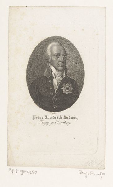 Editor: Here we have an engraving from 1825, "Portret van Alexius von Anhalt-Bernburg." It's quite formal, even severe. What can you tell me about it? Curator: Well, first let's consider its Neoclassical style. It's striving for order and reason, a conscious rejection of the preceding Rococo’s flamboyance, born out of Enlightenment ideals. This portrait must be viewed alongside of revolutions in thinking regarding liberty and rights of men. Consider the power structures implied in the visual representation of nobility, how this image functions to uphold and legitimize their rule. Editor: So, it's not just a portrait, but a statement? Curator: Precisely. And a complex one. Engravings like these circulated widely, shaping perceptions of power. Who was this intended audience and how did gender or social class factor in its reading? The details matter: the crisp lines, the emphasis on classical composition. Note the symbolic weight in the meticulously rendered uniform and medals. Editor: It makes you wonder about the artist’s intentions, whether this portrayal of a noble projected authority, vulnerability, or both. How do you see it fitting into art history more broadly? Curator: I think it highlights the contradictions inherent in the Neoclassical movement itself—seeking to emulate the perceived democratic ideals of antiquity, while simultaneously serving to uphold existing hierarchies and power structures. That tension is what makes this piece so compelling for me. And what do you make of it? Editor: I agree, that contrast definitely complicates it. Seeing how art interacts with those broader societal shifts is fascinating. Thanks, I learned a lot! Curator: My pleasure. Keep questioning, keep connecting art to the world around it.