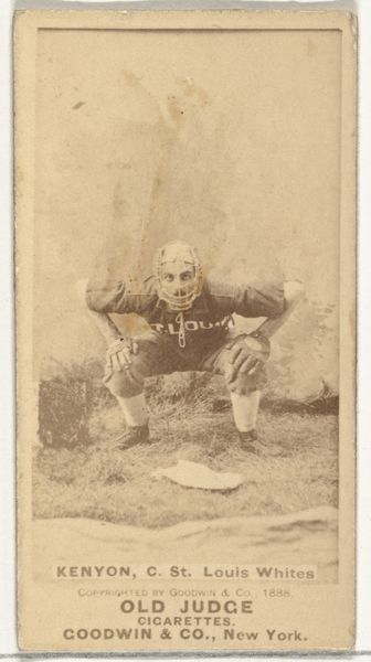 This photograph of Frank Sylvester "Silver" Flint, a catcher for Chicago, was produced by Goodwin & Company in 1887 as part of a series of baseball cards included with Old Judge Cigarettes. Printed on thin paper stock, it belongs to a tradition of commercial ephemera which exploded in the late 19th century, fueled by new printing technologies. The photograph itself would have been taken in a studio, meticulously staged. Then, many identical prints would have been made in industrial quantities. The sepia tone is achieved through chemical processes, typical for the era, lending a sense of nostalgia and historical distance to the image. The mass production and distribution of these cards reflects the rise of consumer culture, linking the consumption of tobacco with the burgeoning popularity of baseball. In this context, the image of Flint becomes a commodity, bought and sold as part of a larger network of capitalist exchange. The image thus reminds us that even seemingly simple things are tied to wider social issues of labor, politics, and consumption.