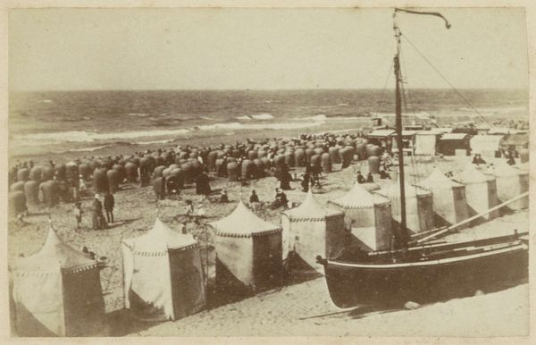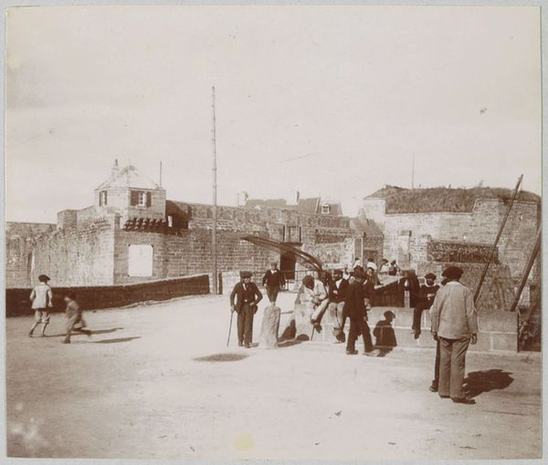 Editor: So, this gelatin-silver print, "Mannen op de kade in de haven van Concarneau," was taken in 1901, and the atmosphere feels very still. It shows men along the docks of Concarneau...What do you see in this piece that maybe I'm missing? Curator: The repetition of figures is intriguing, almost iconic in its rhythm. Look at how the rigging of the ships mirrors the upright posture of the men; even the fort in the background carries that symbolism of permanence. Notice the careful layering. Editor: Layering as in foreground and background, or...? Curator: Yes, the composition itself, but also how the photographer allows the scene to reveal itself. What do you think this kind of mirroring between humanity and setting is trying to convey? Editor: Maybe that they're inseparable? The identity of the town relies on the labor of these men, and the harbor setting in turn gives purpose to them... Curator: Precisely! The photograph becomes more than just an image. The photograph’s emotional tone is somber as the city fades into sepia in the background. I am curious to wonder if we look into the past and are never fully able to know everything. Editor: I like the detail that everything has a purpose. It makes this photograph much more beautiful and deep. Curator: Exactly, a dialogue between land, labor, and legacy, that is visually so satisfying.