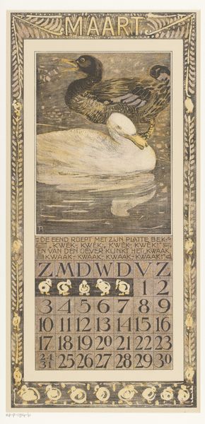 Curator: This is Theo van Hoytema's "Kalenderblad maart met twee hanen" or "March Calendar Sheet with Two Roosters", created in 1904. You can see it here at the Rijksmuseum. What are your initial thoughts? Editor: The composition strikes me first—the dominant, somewhat menacing presence of the roosters looms over the very regimented calendar grid below. It’s an intriguing tension between the natural world and human organization. Curator: I agree. Considering Hoytema's background as a lithographer, it’s vital to explore how the print medium impacted this particular artwork and others in the same vein. Mass reproduction and distribution undoubtedly made his nature-inspired Art Nouveau style accessible to a wider audience. Editor: Absolutely. But let’s not ignore the powerful symbolism! The two roosters, with their vibrant plumage and fierce gazes, could represent themes of virility, dominance, perhaps even the impending arrival of spring after the long winter. Look closely at the subtle application of watercolor washes; how would you characterize that effect? Curator: Very nuanced, giving warmth to the whole calendar. The choice to combine illustration with a functional calendar served a commercial need: Hoytema created art for a very clear social function. What does it reveal about cultural attitudes towards nature at the time, given increasing urbanization and industrialisation? Editor: That’s a valid point. I observe how the carefully rendered borders and typography create an enclosed space, framing and aestheticizing the wildness of nature. It seems to almost be a symbolic capture, wouldn't you say? A visualization of man controlling his natural environment through art. Curator: Precisely. And by reproducing this artwork, it brought elements of nature and notions of artistic sophistication into the homes of everyday consumers, reflecting the democratizing ideals of the Art Nouveau movement itself. The production is very significant. Editor: Thinking about it now, the work as a calendar takes on new significance. A simple organizational tool, it seems, now possesses far greater expressive force, reflecting perhaps our persistent negotiation with both time and nature. Curator: Yes, it's all these things considered, process, context, medium. That makes it the enduring artwork that it is. Editor: A fascinating interplay of form, content and materiality that lingers in the mind long after you’ve noted the date.