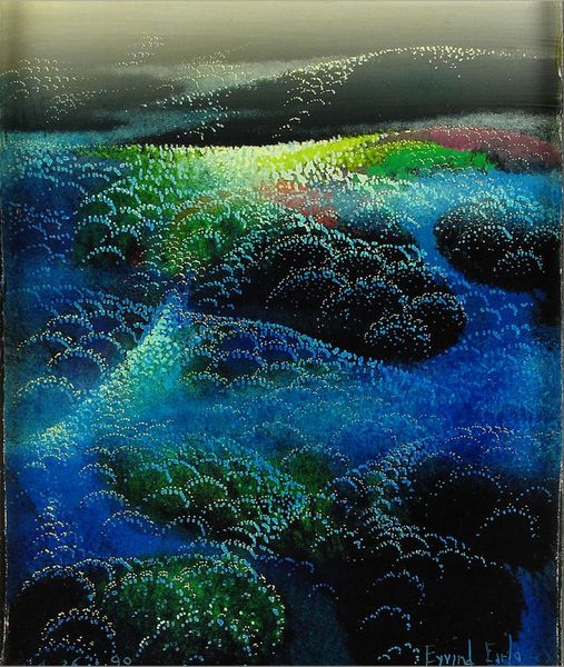 Curator: Immediately, I sense an aquatic dreamscape, like floating among bioluminescent plankton. Editor: Indeed. Let’s explore Hideo Hagiwara's "Play Ground (2)," at the Harvard Art Museums. It's a modest-sized print, about 45 by 59 centimeters. Curator: The orbs certainly dominate. They feel symbolic, almost like eyes or celestial bodies, set against that rich, mottled green. Editor: The lines create a semiotic field, evoking meandering paths or perhaps even a musical score. The artist's choice of texture adds to the complexity. Curator: The title, "Play Ground," suggests a deeper layer of meaning. Perhaps this is a visual metaphor for the freedom and exploration of childhood imagination. Editor: Perhaps so, but the interplay of line, texture, and color establishes a visual syntax inviting close formal reading. Curator: Ultimately, this work reminds us that art offers more than meets the eye. It's a journey into the realm of shared symbols and personal interpretation. Editor: A journey made all the richer by its self-contained, abstract formal language.