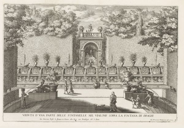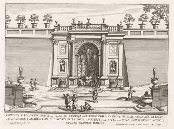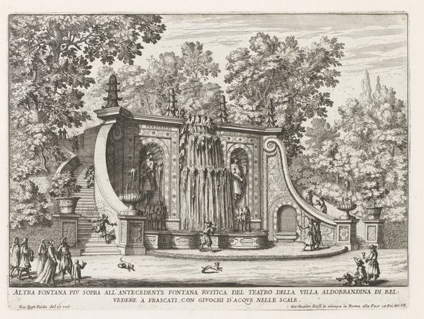 Editor: So, we’re looking at "Fountain in the Gardens of the Villa Aldobrandini in Frascati," an engraving and print made sometime between 1653 and 1691 by Giovanni Battista Falda, currently housed at the Rijksmuseum. It strikes me as a very precise, almost architectural portrait. What do you see in this piece that maybe I'm missing? Curator: Ah, yes, a garden as imagined architecture! The black and white lines invite you into the print. Do you hear the echoes of splashing water? Baroque art had this wonderful knack of embracing grandeur. It wanted to dazzle and surprise. Look at the way the fountain is centered but the flanking landscape seems to breathe a little more freely. Are the tiny figures just observers, or active participants within a story being created? What about those symmetrical lines? Editor: That’s interesting. The figures definitely add life to what could be a static image. Is that contrast of nature with architectural, almost geometric shapes intentional? Curator: Undoubtedly. Remember the context! Aristocratic families would create gardens that mirrored their ambitions and control. The villa becomes an extension of power and taste. Those perfectly sculpted trees in the distance tell a silent story. The sound of trickling water in that landscape speaks to so much in the human heart and its connection to nature. Where would the perfect villa be, but near that perfect oasis of sound? Editor: I see. It's more than just a pretty picture; it’s about control and status. Curator: Precisely! It reminds me how much art can be a looking glass into the hearts of past patrons. Editor: It does give you a lot to think about; I hadn't considered the statement it makes about power. Thanks!