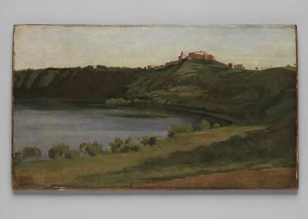 Editor: Here we have Corot's "Italian Landscape," painted sometime between 1825 and 1828. It’s an oil painting with such a subdued palette, it almost feels like a sepia-toned photograph. What strikes you most about this scene? Curator: It feels almost… primordial, doesn’t it? Corot captures something fundamental here. It's not just a transcription of a place, but an evocation of time and light itself. Notice how the warm light bathes the landscape, softening the contours, blurring the distinction between earth and sky. Does it make you think of something beyond its apparent subject? Editor: I see what you mean. The light is beautiful. It feels almost biblical, in a way – like something from the Old Testament. Curator: Precisely! There's an underlying harmony between humans and the world. Think about the plein-air tradition. Courbet went directly to nature, working outdoors with great commitment, observing all the coloristic changes in order to seize the transient effects of light. What mood do you think this captures? Editor: A sort of peaceful acceptance. No grand statements, just quiet observation. It's beautiful, even though the landscape itself isn’t classically beautiful, like a mountain vista or something. Curator: Indeed! The genius of Corot is his ability to find the sublime in the seemingly ordinary. Perhaps that’s what makes this small painting so incredibly resonant. I find I can look at this view and discover new emotional resonance time after time. Editor: I agree. I appreciate how his unique perspective helps transform my perception too. It’s like he unlocks a different way of seeing the world.