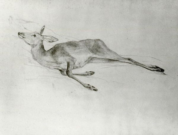 Editor: Here we have Gustave Courbet's "The Dead Doe," painted in 1857, using oil on canvas. I am immediately struck by how simply and directly it portrays this animal’s lifeless body. It feels very grounded. What can you tell me about how this fits into art history? Curator: Well, at the time, Courbet’s realism was quite a deliberate break from academic tradition. The Salons favoured historical paintings or romantic landscapes; representations of everyday life, let alone of dead animals, was deemed less worthy. Courbet championed art reflecting the reality of the present. Consider how this imagery interacts with social ideas around hunting and land ownership in mid-19th century France. How do you think this piece would be received by audiences of the time? Editor: It’s fascinating to consider that audiences were perhaps unused to such a frank depiction of nature and death. It challenges notions of ideal beauty and noble subject matter that would’ve dominated art institutions. I wonder, does the way the animal is staged—lying vulnerably on the ground—affect how viewers engage with it? Curator: Absolutely. Think about it—Courbet’s choice of subject forces viewers to confront mortality and nature’s raw indifference, which wasn’t really fashionable back then. How does Courbet's unflinching gaze contrast with the sentimentality often seen in earlier depictions of animals? This is about seeing and feeling. This is what he brought to the stage for change. Editor: I see how, in that sense, Courbet might have been seen as subversive or, at least, challenging of established aesthetic and political norms. It makes you wonder, what other realities were previously considered unfit subjects for ‘high’ art? Curator: Exactly! And thinking about Courbet, this raises a fundamental point of understanding about how power structures control what art is seen and valued. Editor: This was very helpful, thanks! I'll keep that in mind as I continue learning about this artist!