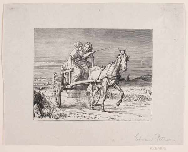 Curator: Let’s pause here for a moment. What’s catching your eye? This is “L’Estafette,” an etching and engraving by John-Lewis Brown. It was made sometime between 1847 and 1890. Editor: Immediately, a sense of urgent motion. The frantic energy—it’s all right there in those agitated lines. But there’s also a kind of wild romanticism. Like a dream speeding away. Curator: I see what you mean about the Romantic sensibility. Brown definitely seems drawn to the drama of the subject matter, and that comes across in the frantic rendering of the scene. The rider and the horse are practically one entity. The estafette, in French, means a mounted messenger. A symbol, really, of urgent communication. Editor: Communication, yes, but also something deeper. Messengers often carry secrets, right? Or critical turning points. This figure feels burdened with news… but is it good or bad? I’m strangely unsettled. Curator: That unease is palpable. The artist captures the weariness, both physical and emotional, etched into every muscle of the horse and every fiber of the rider’s posture. Editor: Look at the rider's expression, too. It’s really hard to make out with so few lines, but he's leaning into the wind. The image reads to me as a memento of some pivotal moment lost to the depths of time. Almost like we’re overhearing an urgent whisper from a forgotten age. Curator: A ghost rider of information, eternally racing to deliver his news. This small print encapsulates such a specific time, when messages traveled this way. It’s fascinating how Brown elevates the humble messenger to something nearly mythical. The material used captures the theme perfectly. Editor: The texture itself adds to the sense of a half-remembered moment. The printmaking is wonderful. The lines look intentionally imperfect, mirroring memory's unreliable quality, like the details might be changing even as you watch. It makes you ponder what message is he actually carrying... Perhaps one we’re not meant to know after all.