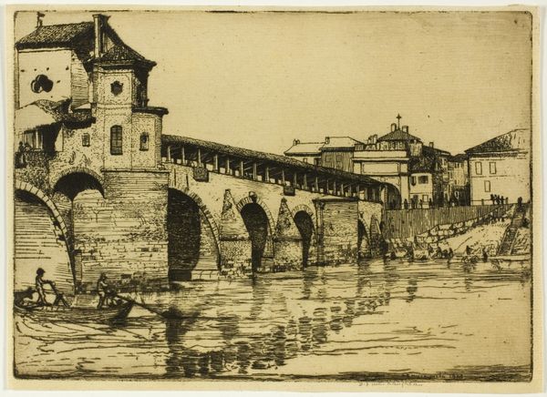 Curator: Donald Shaw MacLaughlan's "Ponte Ticino, Pavia" presents us with a striking image of the covered bridge. MacLaughlan, born in 1876, captures the architectural grandeur with meticulous detail. Editor: It’s beautiful, and what immediately strikes me is how the intricate detailing of the bridge contrasts with the fluidity of the water, which really emphasizes the enduring nature of human construction against the natural world. Curator: Yes, bridges have always been more than just crossings; they are crucial to political and social landscapes. Considering Pavia's history, this bridge probably played a key role in trade and control. Editor: Absolutely. And the figures in the boat could be seen as marginalized individuals who are literally navigating around those dominant structures. How might they challenge the power structures symbolized by the bridge itself? Curator: That's a fantastic way to reframe the artwork; it makes the piece even more compelling. Editor: I agree. MacLaughlan encourages us to reflect on infrastructure and its diverse significance across the ages.