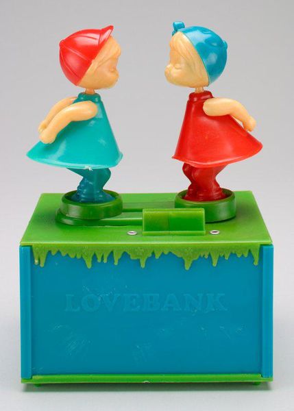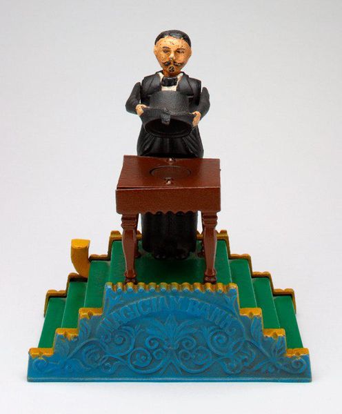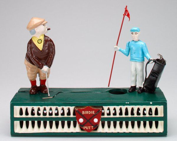 Editor: Here we have -Strike- mechanical bank, produced around 1970 by Utexigual Products Inc. It's a delightful sculpture made of metal. I'm immediately drawn to the kitsch style. It feels so playful and nostalgic. What stands out to you when you look at this? Curator: Well, looking at the materiality of this piece is fascinating. The fact that it's cast metal points to mass production, a move away from unique, handcrafted items towards consumer goods. This piece reflects the labor and industrial processes that shaped mid-20th century America. Does it make you think about who might have owned and used this? Editor: I imagine a kid, probably. It being a bank makes me think the point was to encourage saving but in a fun, engaging way. Does that relate to what you were saying about consumption? Curator: Precisely. The act of depositing a coin becomes a spectacle, linking labor (earning money) to immediate gratification through this miniature bowling performance. It blurs the lines between high art and craft, functioning simultaneously as a toy, a bank, and a representation of leisure. Notice how it commodifies even the idea of a "strike"—instant success purchasable with a coin. It's about making production fun, no? Editor: That's interesting. It makes me think about how we consume even leisure activities, like bowling itself, through manufactured goods and experiences. I hadn’t considered the labor aspect tied to even this toy. Curator: Exactly. Everything is linked to its production! Editor: Thanks so much, I see it totally differently now! Curator: My pleasure.