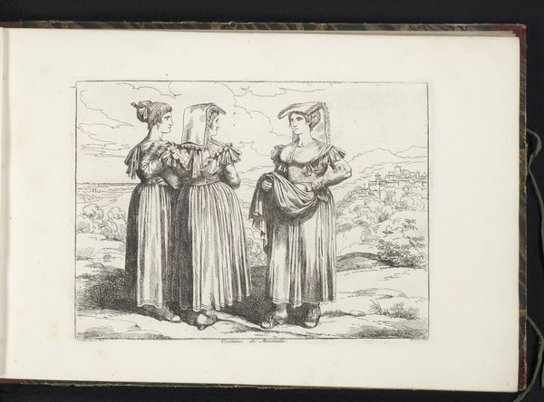 Curator: This is "Three Women from Sonnino" by Bartolomeo Pinelli, created in 1819. Pinelli was a master of etching, and here he used ink on paper to depict a scene from daily life in the Roman countryside. Editor: The light in this piece strikes me first. Even with the stark ink lines, the figures are rendered with such volume, the fabrics of their garments seem to catch the sun. And look at the way their expressions, it really tells of some narrative! Curator: Exactly. Pinelli wasn't just capturing what people looked like, he was also very much portraying Roman identity and social norms. His artistic production fed into a burgeoning market of grand tourists seeking out an idea of Italy, and as an etcher and engraver he made this subject-matter accessible for a broad audience. It’s genre painting but elevated through the skill and distribution. Editor: And you see how distinctly Pinelli renders the individual garments: each crease, each fold and seam is a testament to skilled labour—you start thinking of the processes that went into them. The way those lines gather and swell really conveys that handcraft so immediately. Even if they seem standardized, the clothes also mark differences: there are very minute design shifts in terms of the three different women's clothing that indicate levels of personal tastes. Curator: That focus also served the nationalist project of the Risorgimento, framing regional traditions in heroic terms and feeding the myth of a unified people rooted in common traditions. Pinelli also ran in somewhat radical circles. His etchings made imagery of popular life, popular unrest, and brigands visible—images circulated to comment and shape civic culture. Editor: That’s powerful – his decision to work with the immediacy of line in turn produced direct narratives. By attending to how ordinary clothes take on material qualities that signal class, skill, taste, and custom he delivers more than just picturesque scenery. This emphasis humanizes the scene and renders the viewer complicit in the creation of a sense of national identity. Curator: Precisely. He walks the line between objective observation and politically charged narrative. Thinking about "Three Women from Sonnino", in terms of the wider politics it speaks of the drive to visually consolidate notions of Italian-ness, through both making art available and depicting regional characters from everyday life. Editor: It's fascinating how something created with such direct and utilitarian methods— ink on paper—can carry such potent narratives about tradition, labor, and national identity even now.