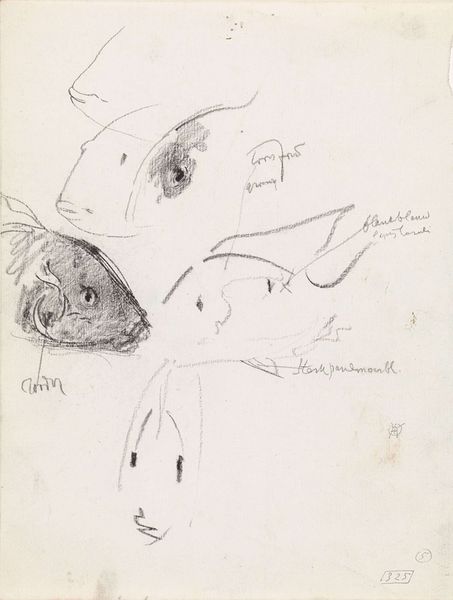 Curator: Well, this piece presents us with a fascinating contrast! Before us is Gerrit Willem Dijsselhof's "Studies van vissen," dating roughly from 1876 to 1924, housed right here at the Rijksmuseum. It's a pencil drawing on paper. What are your initial thoughts? Editor: Ethereal comes to mind. These fish seem almost like ghosts suspended in a boundless space. The light pencil work contributes to the dreamlike quality, like sketches from a half-remembered dream. Curator: Interesting! Considering the period, I see a convergence of industrial advancements impacting fishing techniques and a growing awareness, albeit limited, about the marine environment. Dijsselhof was deeply concerned with the materials used to create an image; do you see how the pencil's potential informs our perception of ephemerality, connecting to that moment of environmental and societal anxiety? Editor: Absolutely. And beyond the medium itself, consider the subjects: fish. Who gets to define what lives matter? This sketchbook could be an exploration, or even a challenge to late 19th and early 20th-century hierarchies of living beings during times when species were disappearing as new production methods led to both human and non-human exploitation and extinction. The drawing style mirrors that lack of sharp definition in broader social narratives and assumptions about "value." Curator: I appreciate that intersectional viewpoint. For me, the roughness of the lines points to Dijsselhof’s experimentation. Was it a study towards a larger work? Or maybe simply him figuring out the barest representation of an idea? One could imagine his intense focus and interaction with his craft and labor. Editor: It challenges that separation, right? Isn’t observing and drawing also a form of "labor," of trying to capture the truth and meaning that one encounters in an environment? So, it blurs the lines, if you will, about our perception of "work." But look closely, you notice how it seems unfinished. Can one extrapolate, then, a larger narrative of a culture in progress and of environmental activism still needing progress and definition? Curator: Exactly, and from my angle, these 'incomplete' details underline the physicality of the process itself: the hand moving, the pencil dragging and making marks. I am so intrigued by these questions. What do you think about how relevant such material interactions remain for contemporary artists engaging in similar experimental mark-making in a digital era? Editor: Well, now I see even more clearly what is at stake in interpreting it for the present day. It is definitely food for thought for understanding the past and the possibilities that the future offers for both the environment and ourselves.