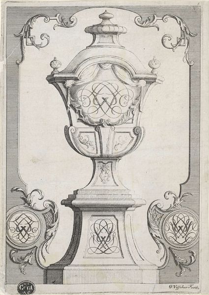 Editor: This engraving, "Panel with Garden Vase with Satyrs and Monograms in the Corners," created by Gerrit Visscher between 1690 and 1710, showcases incredibly detailed linework. The vase itself seems to depict playful satyrs. What's striking to me is how this print elevates a functional object—a garden vase—to a work of art. What stands out to you about this piece? Curator: From a materialist perspective, this piece intrigues me. Engravings like this served as vital tools for disseminating designs and influencing tastes in the late 17th and early 18th centuries. The print wasn’t merely a representation; it was an active participant in shaping the material culture of the Baroque period. Consider the labor involved: the skilled engraver meticulously transferring an image onto a copper plate, allowing for mass production and wide distribution. Where do you think these designs would have been most impactful? Editor: Probably influencing wealthy patrons designing their gardens and commissioning actual vases! I imagine this kind of print democratized design ideas, spreading new aesthetic trends. The act of replicating the design for a garden would create new job opportunities for stonemasons, gardeners, metalworkers and boost other areas of material production. Curator: Exactly! The circulation of these prints fuelled specific sectors of production, showcasing the interwoven nature of art and industry. This wasn't just about aesthetics; it was about material production, social aspiration, and the reinforcement of class structures. Think about the paper it's printed on, too, and the origins of that material in the wood industry! Editor: That makes me think about the environmental cost as well, of course. Thanks for this analysis! I never would have considered all those industrial facets on my own! Curator: Understanding the material origins and production processes brings a crucial lens to understanding the artwork’s meaning and cultural impact.