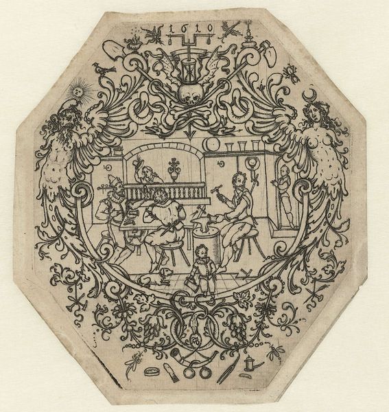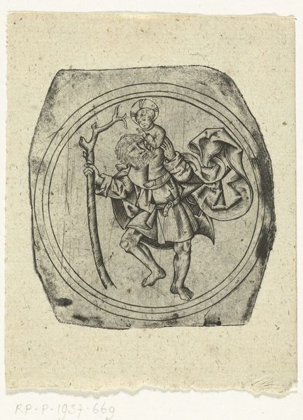 This circular print, "St. George Killing the Dragon", was created by Master B with Two Crossed Daggers, using engraving. The intricate composition and dense network of fine lines create a visually captivating scene. Notice how the composition divides the pictorial space. On the left, we see St. George on horseback confronting the dragon, while to the right, a princess observes the scene, set against a backdrop of a townscape. The artist skillfully balances these elements within the circular frame, drawing the eye around the narrative. The textures achieved through engraving are remarkable. Close examination reveals how the varying densities of lines create depth and volume, particularly in the rendering of fabric, foliage, and the dragon's scales. The contrast between light and shadow enhances the drama, underscoring the triumph of good over evil, a central theme of the St. George legend. This print's detailed execution and balanced composition reflect broader artistic and philosophical concerns, where the formal qualities of the artwork underscore its narrative power.