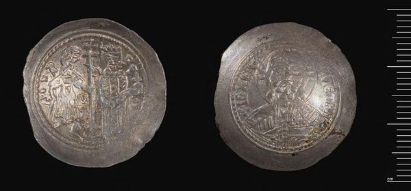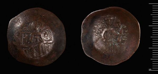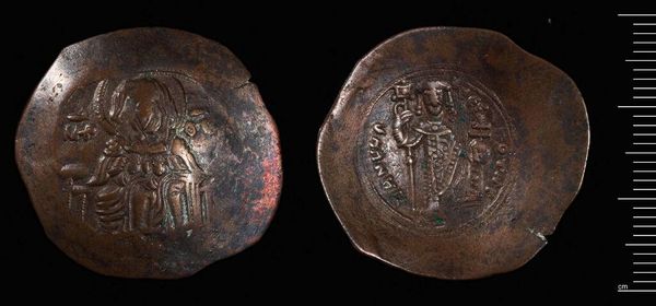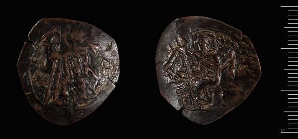 Editor: Here we have a coin, "Coin of Manuel I." What strikes me is its heft; it feels like it carries centuries of stories, worn smooth by countless hands. What do you see in this humble artifact? Curator: I see a tangible link to the Byzantine Empire, a world of opulent ceremony and intricate power dynamics. This coin isn’t just currency; it’s a statement. It speaks of Manuel's ambition, maybe a touch of paranoia, immortalizing his image for posterity. The iconography is less about accuracy and more about asserting imperial authority. Editor: So, it's less a portrait and more of a propaganda piece, if I understand correctly. Curator: Exactly. It’s a carefully crafted message, designed to resonate with a specific audience. Seeing the artistry embedded in something so small reminds you of the power of symbols. Editor: I never considered it that way; I'll keep that in mind.