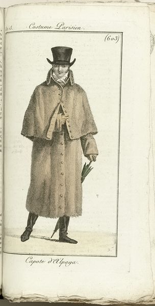 Editor: Here we have Horace Vernet's "Journal des Dames et des Modes, Costume Parisien, 1805, An 13 (607) Redingote à la Charlemagne...", an engraving from 1805. It features a man's attire from behind, and the long coat seems so formal. How do you interpret this work, considering its context? Curator: Well, seeing this through a contemporary lens, it's interesting to consider the politics embedded within even fashion plates of this era. This image, intended to showcase style, also speaks to social hierarchies and the male gaze inherent in depictions of luxury. Who were these publications targeting, and what ideologies were they subtly reinforcing about gender and class? Editor: That's a fascinating point. I was just thinking about the aesthetics, but you're right. It’s published under the French Republic. Curator: Exactly! It reflects a post-revolutionary desire to codify new social structures, and the return to an aristocratic idea that the wealthy should be represented as fashionable. Consider, too, how the “Charlemagne” coat connects back to historical power, potentially legitimizing Napoleon's rise by associating it with previous rulers. Were such style choices actively inclusive, or were they geared towards constructing barriers of identity? Editor: I never thought about it in that way, associating clothing with power! I was mostly focused on the details of the outfit. Curator: Think of it as visual language – what stories does it tell, and whose voices are amplified or silenced? Even an image intended for fashion has the power to reflect political statements. Editor: That completely shifts how I understand the piece! It's more than just an image of clothing; it's a historical document. Curator: Precisely! Art – even fashion illustrations – acts as a mirror reflecting societal values, hierarchies and shifts in political discourse. Editor: Thanks! I learned to see fashion not as a matter of personal taste, but as a reflection of broader socio-political dynamics. Curator: Exactly. It invites deeper explorations.