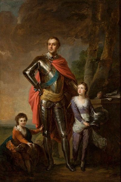 Curator: Benjamin West's 1783 oil painting, "George III," presents us with a regal portrait, a formal exercise in the language of power. Editor: My first impression is one of...defensiveness. The heavy armour feels less celebratory and more like a visual barricade. What narratives of security and protection are being presented here? Curator: Indeed. Note the strategic arrangement of objects. The distant naval battle—implied power—the orb and sceptre, subtle to the left—promised governance. And the texture! The contrast of the ermine with the cold steel is masterful. Editor: Precisely. It seems designed to project invincibility, yet given the historical context—the loss of the American colonies looming—the armour feels ironically vulnerable. The ships in the background only amplify a sense of receding power. I wonder, is this image consciously or unconsciously communicating geopolitical tensions? Curator: The composition guides the eye to the face. Note the subtle tension in the jaw, the meticulous lighting… West has deployed the established portraiture playbook with finesse. This work stands as a critical example of how Academic Art elevates its subjects through technical excellence and studied formality. Editor: But is that elevation authentic or propagandistic? Who benefits from this constructed image of unwavering strength? Understanding who it served then may allow us to grapple with power structures now. Curator: And how are those structures constructed? Look at the interplay between the shadowed background and the reflective metal. Or perhaps the composition is the narrative here—vertical figure opposed to the receding landscape. We could use structuralist ideas about binary oppositions to discuss meaning in art. Editor: Perhaps—though to isolate the painting in purely visual terms feels reductive. How can we truly understand it divorced from its relationship to systems of colonial authority and class inequity? The armour here serves more as a symbol of domination and potential repression than simple formal contrast. Curator: Well, whether considering visual composition or historical implications, West's work provides a fascinating lens for considering image, construction, and presentation of authority. Editor: Absolutely. Ultimately, this is a reminder that a portrait—no matter how artful—can be both a work of art and a document of power and influence.