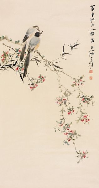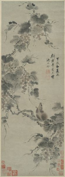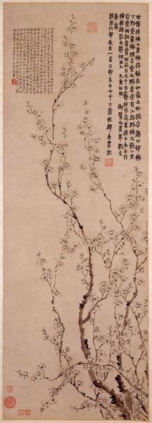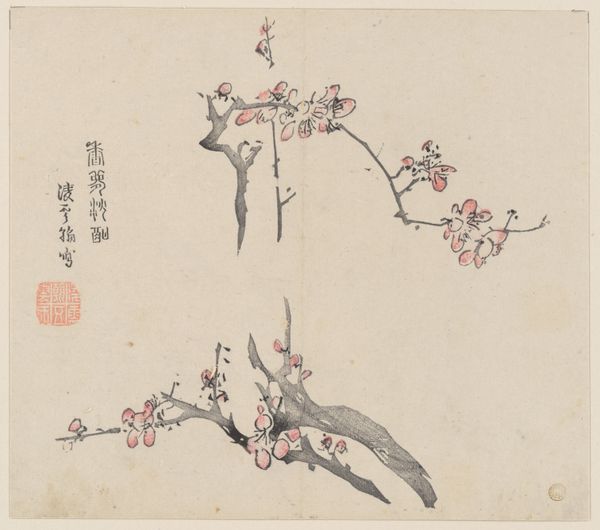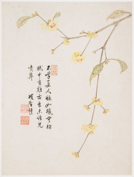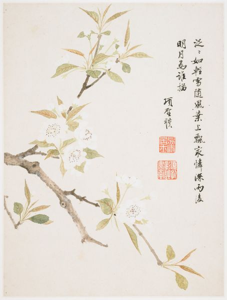 Curator: This elegant painting, dating to 1656, is titled "Blossoming Plum from a Flower Album of Ten Leaves" and was created using ink and watercolors. It’s currently located here at the Minneapolis Institute of Art. The artist is Xiang Shengmo. Editor: It's deceptively simple at first glance, but there's a quietness that's rather compelling. The visible brushstrokes show a delicacy of gesture that makes it quite touching. And look at the way the material—probably handmade paper—embraces the pigment! Curator: Plum blossoms in Chinese art and culture have multiple layers of symbolism. The most prominent meanings associated with the plum blossom are resilience and renewal. It also became connected with Confucian values, purity and integrity of character. This imagery links art and ideology. Editor: Absolutely, it’s also very material! Notice how much the surface quality of the painting contributes to this impression? There's such fine, nuanced use of ink here; and with watercolors you can really achieve soft effects. The way ink merges into the paper texture speaks of the artist's awareness and engagement with the materials. Curator: And that awareness connects the physical object back to the tradition itself! Think of calligraphy also present. Each written word is itself a mark, mirroring the painting strokes, creating textual symbolism and meaning beyond language itself. Editor: You’re right to note the way the artist seems to use writing to almost map thought itself; ink-saturated, each line so purposeful. Curator: For me, considering these blossoms now, it prompts deeper questions of resilience within the culture. They suggest cycles of perseverance beyond an individual, reflecting deeper currents of history. Editor: I keep thinking about the hand that guided the brush, and the specific resources Xiang Shengmo had. Considering those constraints is important when contemplating something like resilience, which may have emerged out of specific socio-economic conditions of production. It’s remarkable how much can be revealed within this spare depiction of a plum.