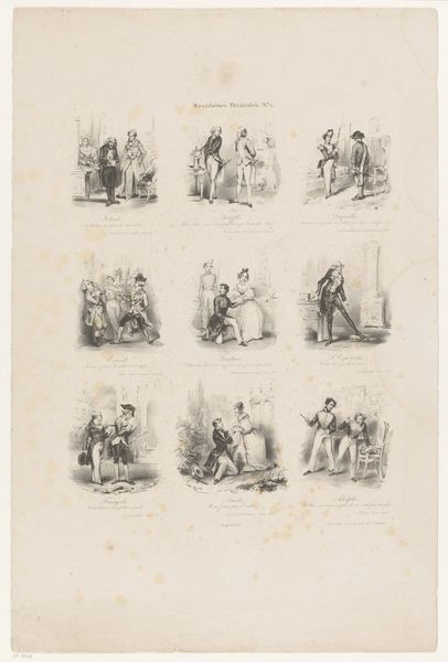 Editor: This lithograph by Victor Adam, titled *Vijftien voorstellingen van Parijse straatventers*, from 1832, depicts fifteen scenes of street vendors in Paris. I am immediately drawn to the sheer variety of labor on display and how that speaks to the booming urban environment of the 19th Century. What does this focus on everyday labor tell us about the culture of the time? Curator: Precisely! The choice of lithography, a relatively new and reproducible medium at the time, is crucial. It speaks to the accessibility of these images and their potential to circulate amongst a wider audience. What does the use of a print, rather than a painting, suggest about its intended purpose? Editor: Maybe that this was meant for more widespread consumption than just the wealthy? Something for the emerging middle class? Curator: Exactly! It suggests a shift in the art market and who art was created for. By depicting street vendors, the print highlights the often-invisible labor that fueled the city's growth. The very process of mass production mirrors the labor practices of the emerging capitalist society. What relationship do you see between the romantic aesthetic of the rendering and the harder, realistic themes depicted? Editor: The romantic style gives them dignity but contrasts with the harsh lives of street vendors. Is the romanticism then being used to sort of ennoble this type of labor? Curator: Interesting question! And how might our current moment, one with even starker wealth disparities and anxieties surrounding labor, re-contextualize a piece like this? Editor: Well, I hadn't considered how relevant it still is! I will look closer at these types of historical works, considering their contemporary relevance to topics such as income inequality, social mobility, and economic pressures of labor! Curator: Indeed! Examining the material conditions of artistic production and the subject matter can provide a powerful lens through which to understand both the past and the present.