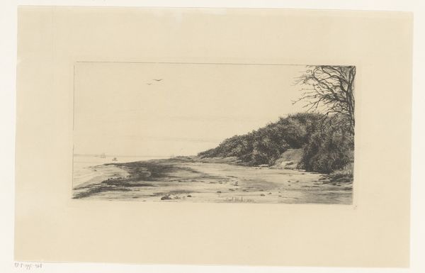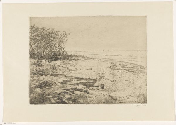 Willem Witsen created this etching, "Kustlijn van de Zuiderzee in Valkeveen," using a monochrome palette and subtle variations in tone. The composition divides the scene into three horizontal registers: the sky, the sea, and the land. This is an evocation of space and distance. Witsen uses the etching technique to play with light and shadow. The etched lines create texture, distinguishing between the reflective wet sand of the beach and the rougher, darker mass of the land. Notice how the artist varies the density and direction of the lines to suggest form and depth. The figures on the horizon, abstracted into simple silhouettes, are a study in scale, and reinforce the vastness of the landscape. The artist's manipulation of light and line also contributes to an emotional landscape. It could be said that the work's formal qualities evoke a sense of solitude and introspection, a visual metaphor for the transient nature of human experience against the backdrop of nature's permanence.