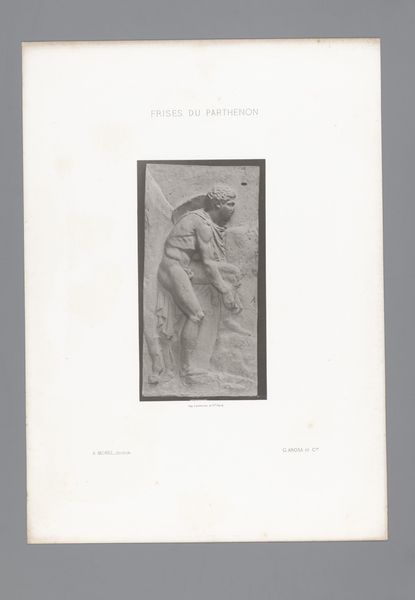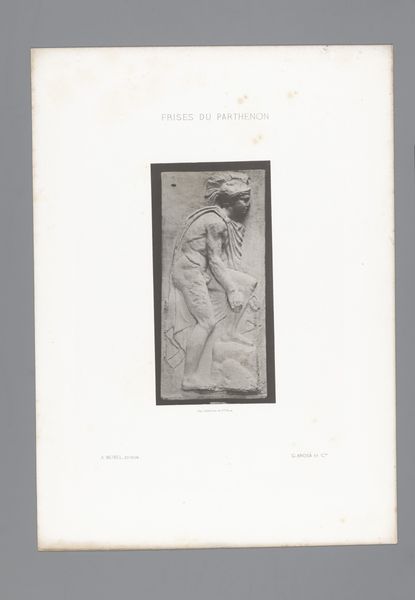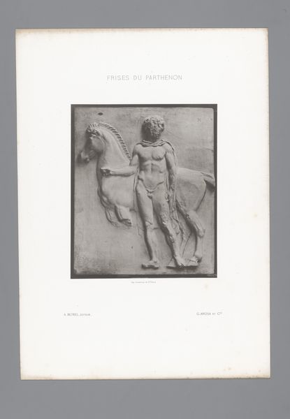 This monochrome print by G. Arosa et Cie presents a section of the Parthenon frieze, depicting two figures. The composition, confined within a square, features a seated male figure alongside a standing draped figure, all rendered in meticulous detail. The structure of the relief employs a rhythmic arrangement of forms and lines, typical of classical sculpture. The interplay between the solid, muscular form of the seated man and the flowing lines of the drapery creates a visual harmony. The texture of the stone is palpable through the print’s detailed rendering, emphasizing the work’s materiality. Historically, such friezes were part of a larger architectural narrative, designed to convey power, order, and cultural identity. The emphasis on idealized human forms reflects classical values of beauty and proportion. This fragment offers a glimpse into the Parthenon's original grandeur, inviting us to consider how such forms communicate complex cultural narratives. The print's monochrome palette draws our attention to the interplay of light and shadow, highlighting the relief's three-dimensionality. These formal qualities are integral not only to the aesthetic value of the work but also to its historical and cultural significance.