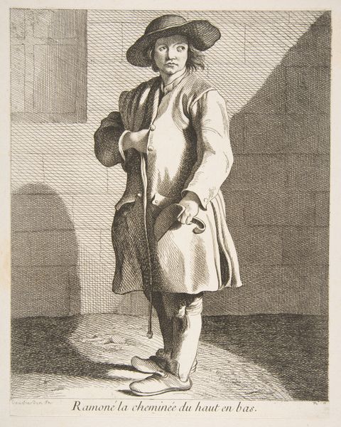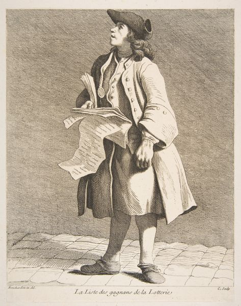 Anne Claude Philippe Caylus created this print called "Rabbit Pelt Peddler." Caylus, a French artist and antiquarian, captures a slice of 18th-century Parisian street life. The image depicts a man, likely of the working class, selling rabbit pelts, essential for clothing during this era. What strikes me is the man's posture, looking upwards, perhaps calling out to potential customers. His gaze suggests a longing, maybe for better sales, or perhaps a larger commentary on the economic disparities of the time. Interestingly, Caylus, a nobleman himself, chose to depict everyday people, indicating the rising interest in representing all social classes during the Enlightenment. However, it is worth noting that this representation might also serve to reinforce existing class structures by portraying the working class in a particular light, for an aristocratic audience. What remains is the emotional weight of labor and survival, inviting us to reflect on the historical conditions and human experiences embedded in this seemingly simple street scene.