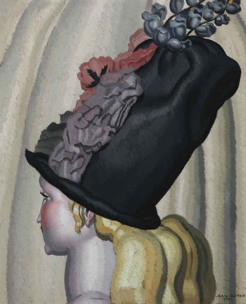 Curator: Jean Dupas' 1928 drawing, "The Riding Crop," presents a striking Art Deco portrait, rendered in pencil. What's your initial reaction to it? Editor: My immediate thought is one of ambivalent power. There's a sense of both fragility and control emanating from the sitter—perhaps due to her slender neck juxtaposed with the commanding riding crop she holds. Curator: Indeed, the verticality of her neck and the riding crop create a strong directional line. The drawing style is typical of Dupas, where simplified forms intersect with more decorative, curvilinear elements to direct our eye around the composition. Look at how he juxtaposes hard and soft textures and light and shadow through careful strokes of the pencil. Editor: Exactly. Her elegance feels intentionally aloof, especially considering that in the late 1920s, during the interwar era, gender roles were shifting but remained deeply policed. A woman holding a riding crop could be seen as provocative—subverting patriarchal dominance. Is she in control of the horse, or of something bigger? Curator: Perhaps that is secondary to the formal arrangements within the work itself. Consider the balance between positive and negative space, the angularity softened by the subtle modeling of her features. It’s this harmony of composition that anchors our perception. Editor: But isn't the formal composition *also* a reflection of social control and power dynamics? The elegant elongated forms give the impression of sophistication that was available only to some—likely an elite social circle far removed from working class struggle. The visual vocabulary speaks of coded luxury. Curator: Certainly, it’s a portrait reflecting a specific social milieu. Consider, too, how Dupas utilized line to emphasize details: the delicate veil, the ornate collar. All carefully drawn to convey her privileged background through mastery of medium. Editor: Those exquisite details also betray the construction of idealized femininity at that moment in time. Her beauty feels almost weaponized. Ultimately, her gesture implies an inherent understanding of her place and a deliberate, knowing gaze. It's difficult to detach that message from the elegance you're admiring. Curator: Perhaps. Regardless, what we've hopefully illuminated for our listeners today is how much complexity can be present within a single drawing—where form and context create meaning in both independent and relational contexts. Editor: Yes, a true Art Deco power pose loaded with material and socio-political considerations!