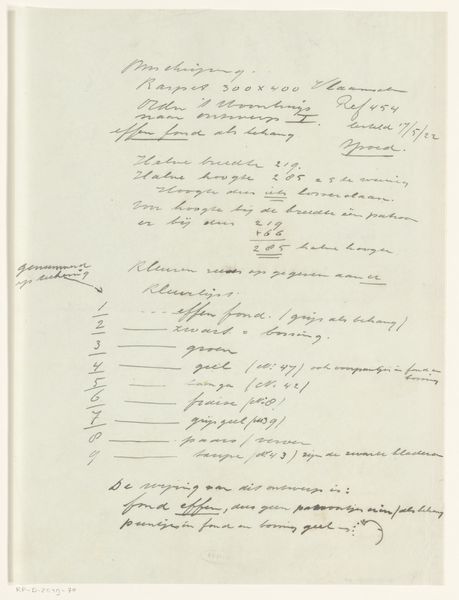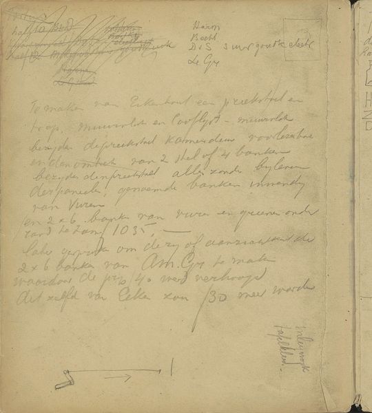 Curator: Welcome. We’re looking at "Driehoek" by Reijer Stolk, a mixed-media drawing on paper that was made sometime between 1906 and 1945. It's currently held in the Rijksmuseum collection. What strikes you about it at first glance? Editor: It has a decidedly ephemeral feel, almost as if we’re looking at something not quite meant for our eyes. There’s this great sense of spontaneity – like catching a glimpse into the artist's private process. Curator: Indeed. Sketchbooks offer an interesting point of access to understanding the creative and, potentially, political climate surrounding artistic production. You see elements here that reflect an early interest in abstraction emerging at that time, and potentially some commentary on trade. Editor: Absolutely. I’m really drawn to the contrast between the more carefully rendered geometric form – the titular triangle – and the more gestural handwritten text. It suggests an attempt to unite the cerebral and the intuitive aspects of creation. The varied weights of the pencil and pen, and that specific kind of paper, signal a very tactile making. Curator: The materials themselves also have their own histories and socio-political contexts. Pencils, paper, and ink become tools, especially within educational structures. These materials allowed Stolk to participate within and offer critical thought toward, larger movements. Editor: Right. And the format itself is interesting: the open notebook shows the means of knowledge production and artistic experimentation. We don’t get to see the artist's process this plainly in many artworks. There's a clear lack of polish, it allows for this material immediacy to jump off the paper and address labor more directly. Curator: Seeing these elements gives us a glimpse into Stolk’s method. In that way it helps break down conventional understandings of his finished artwork. Editor: I agree completely. It’s like peeling back a layer and finding something incredibly raw and vital. It shows that labor is present at every part of this piece, as much as any kind of cerebral construction is. Curator: Ultimately, by inviting viewers into Stolk's private workspace, “Driehoek” also extends an invitation for them to engage directly in his creative dialogues. Editor: Absolutely, I find this particular piece so enlightening and it speaks to how labor is central in production!