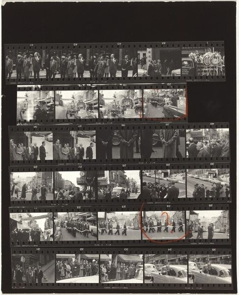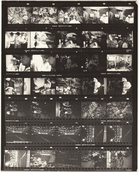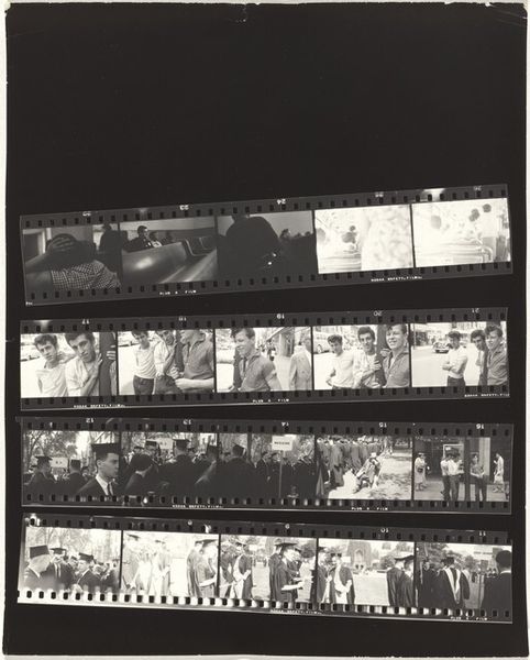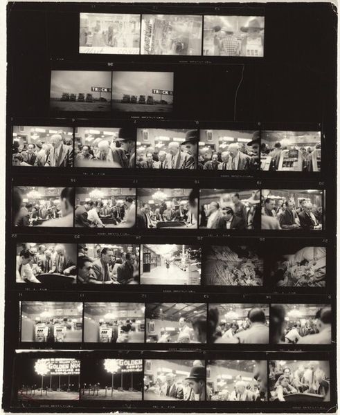 Editor: This is Robert Frank's "Stamp collectors--Paris 23A" from 1949-1950, a gelatin silver print. The entire sheet of negatives gives us a view into Frank's photographic process. I'm curious – what do you see when you look at this particular layout? Curator: What strikes me immediately is the interplay of light and shadow achieved through the monochromatic tones. Note how Frank utilizes the very structure of the film strip—the sequence of frames—to create a rhythm, a visual narrative progression, emphasizing the materiality of photography itself. Editor: I see how the contact sheet format affects how we perceive the images, yes! Curator: Consider also the composition within each frame. Frank's engagement with the ‘decisive moment’ as theorized by Cartier-Bresson is evident, capturing fleeting gestures and candid interactions among the collectors. It's an interesting balance of intention and chance. Editor: So the sequencing of frames and the use of light contribute to its meaning. Do you think the multiple images add a certain...? Curator: Yes. The accumulation and juxtaposition of frames function as a visual essay on collecting itself. It begs the question: how does the photographic archive mirror, or even comment upon, the act of collecting tangible objects like stamps? It isn's just snapshots; there's almost a structural analysis of observation in play here. Editor: It gives an added layer to Frank’s photographic intent, framing his vision more holistically, right? Thank you, this was enlightening. Curator: Indeed, and that is precisely the beauty of close visual examination; structures unveil intentions.