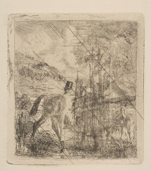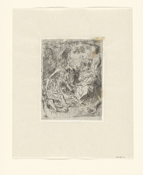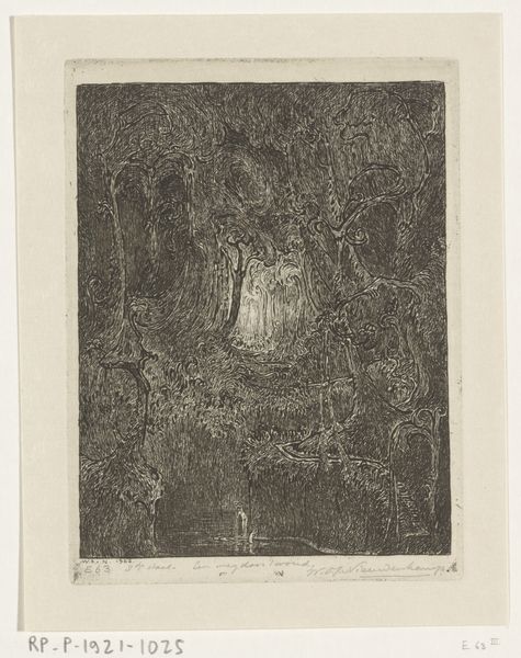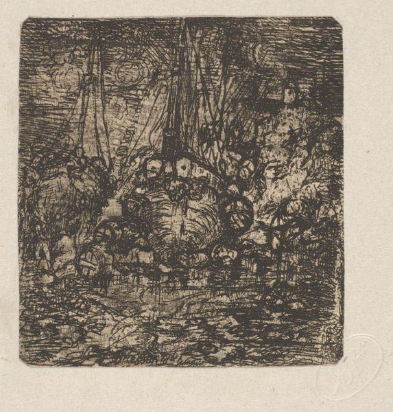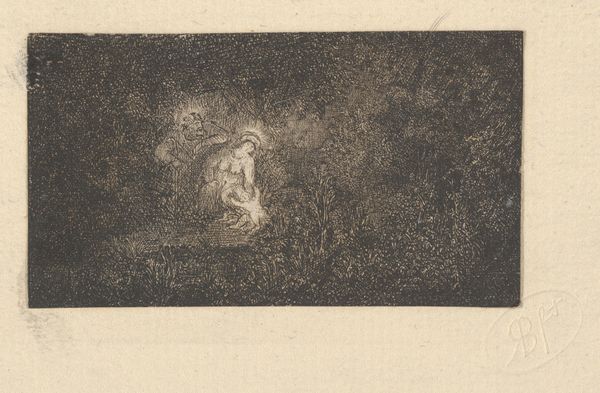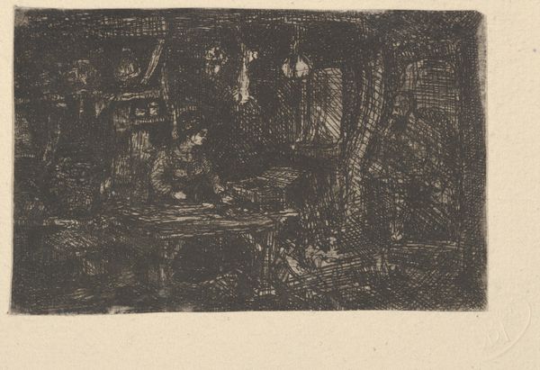 Rodolphe Bresdin created this etching, "Old Man Seated in an Interior," capturing figures in a densely detailed domestic scene. The most potent visual symbol here is the hearth, an age-old motif representing warmth, security, and the heart of the home. The hearth as a central gathering place is an archetype found across cultures, from ancient Roman villas to medieval peasant dwellings. This symbol's endurance speaks to our primal need for shelter and community. We see echoes of this in folklore and fairy tales where the hearth is a place of storytelling and familial bonds. Yet, the shadowy treatment Bresdin applies introduces unease, hinting at hidden anxieties within even the most intimate spaces. Consider how the hearth, once a symbol of hope and communion, can also evoke feelings of entrapment. This duality engages us on a profound, subconscious level, stirring up collective memories and personal experiences associated with home and family. The cyclical progression of this symbol continues to resonate in contemporary art and media, reminding us of the enduring power of archetypes to reflect our deepest emotions.