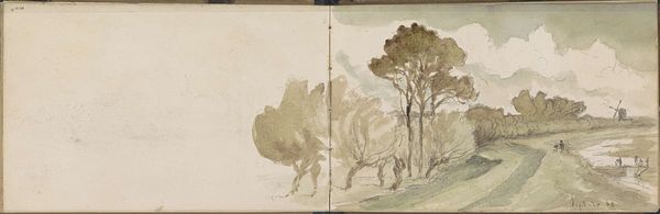 Editor: This is "Berglandschap op de weg naar Marienbad" by Johannes Tavenraat, made in 1869. It’s a colored pencil and pencil drawing, a quick landscape study, held at the Rijksmuseum. There's something very immediate about the rendering of the scene… almost like a visual diary entry. How do you interpret this work? Curator: It's tempting to view it purely aesthetically, but let’s consider the social and artistic context. The late 19th century saw increasing interest in landscape painting and sketching *en plein air*, wasn't it? For middle-class artists, such scenes provided readily accessible and acceptable subjects. It reinforced prevailing Romantic ideas about Nature. Where would you place Tavenraat relative to contemporaneous Realist painters? Editor: Well, the Realists like Courbet aimed for social commentary; whereas this drawing, while realistically rendered, seems more about personal experience and capturing a fleeting impression. Does this have any connections to Impressionism, a style of painting which came later? Curator: Yes! His interest in depicting a specific location connects to Impressionism, which soon influenced art exhibitions, critical acclaim, and purchases. But this work reflects the tastes of emerging museum audiences and art markets; artists could gain status from this kind of subject. Was it a 'radical' or a generally accessible piece for its intended viewers? Editor: Right! It fits existing aesthetic expectations while adding its individuality through subtle details in line and color. It does make you wonder about art buyers at the time… Curator: Exactly, which informs how landscapes are curated and exhibited even now. Editor: I had not considered how socio-political and economics affects our perception of everyday sketches. Thank you for pointing that out.
