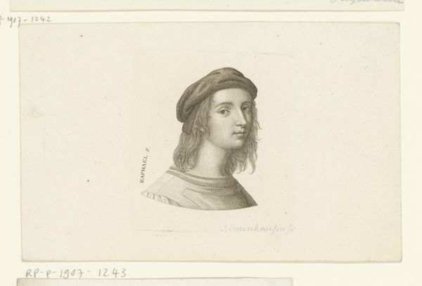 Johann Friedrich Wilhelm Müller created this portrait of Raphael using etching and engraving techniques. The composition centers on the figure, tightly framed to emphasize his face and upper body. The restricted palette of blacks, whites, and greys enhances the linear quality of the engraving. Observe how Müller uses line and shadow to define form. There's a clear structural interest in how light falls across Raphael's face, creating subtle gradations that model his features. The texture, achieved through fine etching, adds depth to the flat surface. The overall effect is one of restrained elegance, typical of neoclassical portraiture which sought to emulate classical ideals of beauty and order. The very medium—etching—contributes to its message. Unlike painting, etching allows for a precise, reproducible image, fitting with the Enlightenment’s focus on reason and standardization. The formal elements thus work together, reflecting a broader cultural desire for clarity and intellectual rigor.