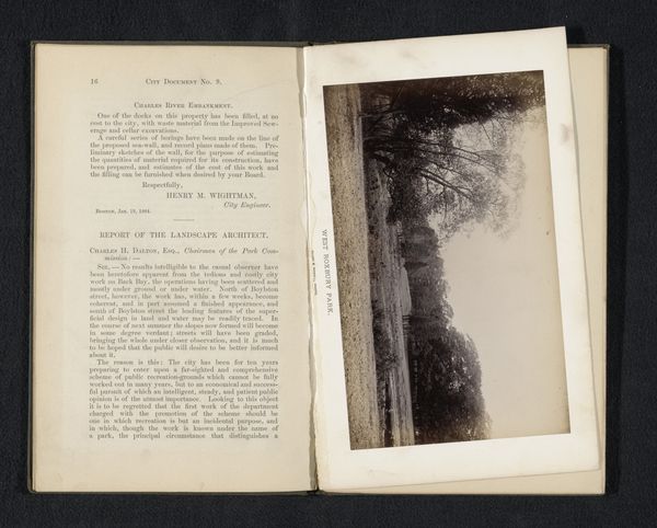 Curator: Let’s delve into this photograph, “Bussey Park,” predating 1883, attributed to Allen & Rowell. Editor: It’s an albumen print… quite delicate, and seeing it presented like this in the bound album makes me think about its original context. The image has a beautiful softness, almost a painterly quality, but what strikes me is that it’s included within this document which reads as an attempt to formally define this new “park” for the people. How do you read that, presented like this? Curator: This is key, a printed object of high production value – it's no mere snapshot, but an articulation of designed nature. Consider the albumen process itself: meticulously layering organic materials to achieve a rich tonal range. And here it sits within a textual frame which works in unison to produce and enforce ideas around nature, access and civic good. Editor: So, not just the depiction of the park, but a crafted artifact that shapes its very meaning. Curator: Precisely. Who had access to these documents? What were the power dynamics at play in the construction of this "natural" space? The print’s very materiality— the paper, the photographic chemicals, the printing process—speaks volumes about the era's values. Were these parks really accessible for everybody? Editor: That’s interesting, how the medium itself and the context it's been used in opens up broader questions about class and power... something I hadn't fully appreciated at first glance. Curator: Indeed, analyzing the materials and the means of production uncovers layers of meaning embedded in the work, moving beyond just its aesthetic value. Editor: I now see this landscape photograph is more than just a pretty picture. It is embedded in layers of history and process which prompt very important questions around access and intent. Curator: Precisely! Thinking about what these objects are "made of," from materials and process all the way through to culture and society can yield so many unexpected insights.